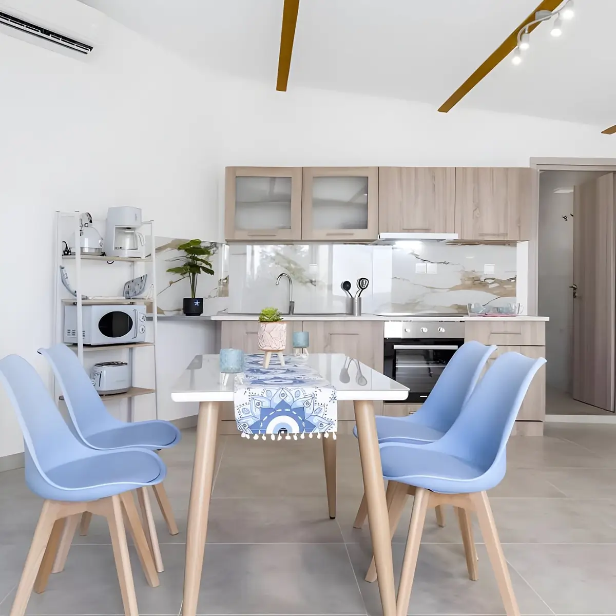 The 57 m² apartment is thoughtfully designed to accommodate up to four guests and features a comfortable bedroom, a bright living room with a sofa bed, a fully equipped kitchen, and a modern private bathroom. High-speed Wi-Fi suitable for video calls, air conditioning, a TV, and a fan ensure a comfortable stay throughout the year. Families traveling with children are welcome, with a baby cot and high chair available upon request.